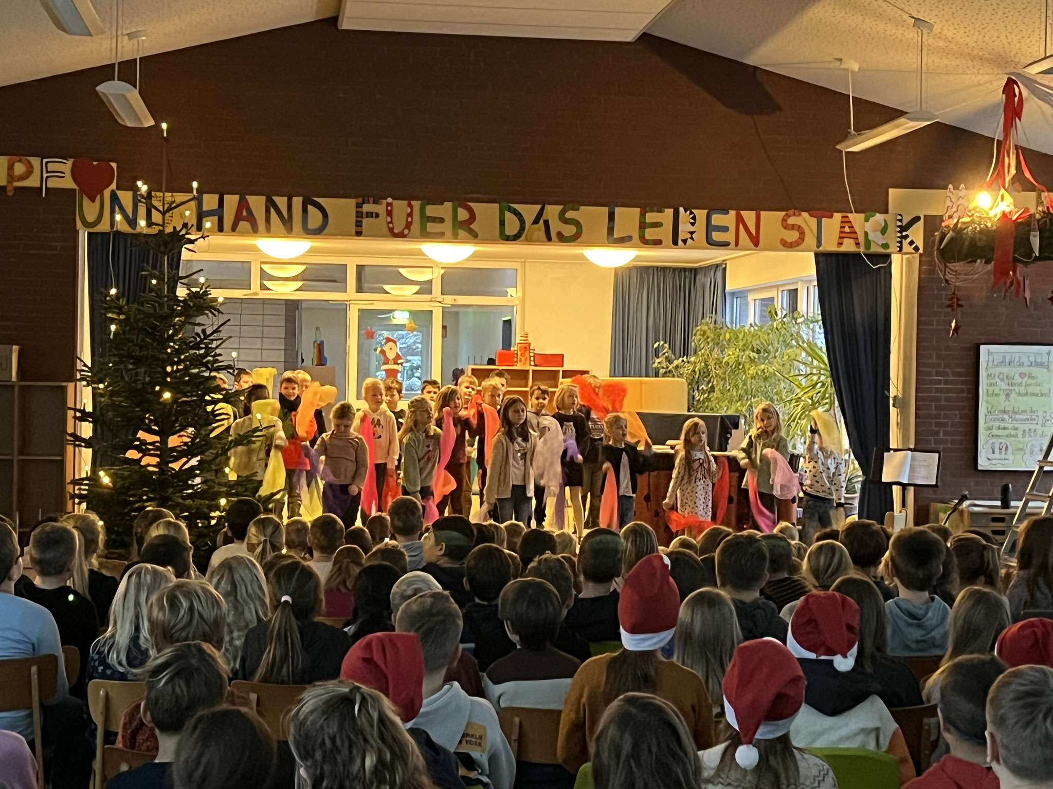Montagsmorgens fand in der Pausenhalle eine Adventsstunde statt, in der gemeinsam Weihnachtslieder gesungen und einzelne Klassen kreative weihnachtliche Beiträge präsentiert haben. Ein Höhepunkt waren die Weihnachtsgalas an zwei Nachmittagen, zu denen auch die Eltern herzlich eingeladen waren. In der geschmückten Turnhalle gab es unterschiedliche weihnachtliche Darbietungen aller Klassen zu sehen, die uns in festliche Stimmung versetzt haben. Außerdem haben wir mit der gesamten Schule das Sulinger Stadttheater besucht und das Weihnachtsstück "Pippi feiert Weihnachten" gesehen. Wir blicken auf eine sehr schöne Vorweihnachtszeit zurück.